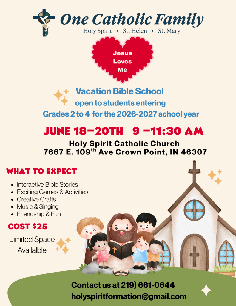 To submit payment online, go to VBS ONLINE PAY or send payment to Holy Spirit Catholic Church, 7667 E. 109th Ave, Crown Point, IN 46307, checks payable to Holy Spirit
