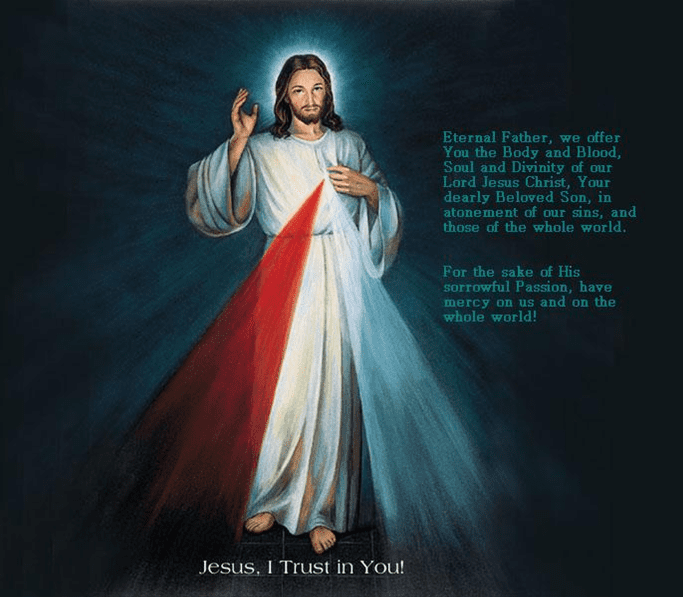 In the past century, three individuals from Poland whose lives overlapped each other—but yet they never met here on earth– championed God’s Mercy. I refer to Sister Faustina, Saint Maximilian Kolbe and the pope, St. John Paul II. Saint Kolbe was a living sign of God’s Mercy. His act of taking another Man’s place in the execution chamber was the capstone of his life. Could you or I show that kind of Mercy? Pope Saint John Paul II also lived God’s mercy through his teachings and personal life. Remember when he met with the man who attempted to assassinate him? He didn’t shout, condemn, or berate the man. No, St. John Paul forgave the man. Could you do that? The second encyclical written by him is named Dives in misericordia. He has been named The Great Mercy Pope. St. John Paul was aware of an obscure Polish nun called Sister Faustina. As pope, he promoted her message of Mercy and established today’s feast. We know the story of Sister Faustina. She received beautiful and challenging messages from the Lord about our need to REPENT and graciously accept God’s gift of Mercy. Above is the incredible picture painted of her vision of Christ in His Mercy.